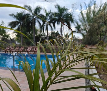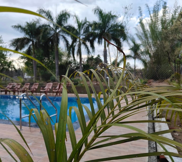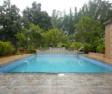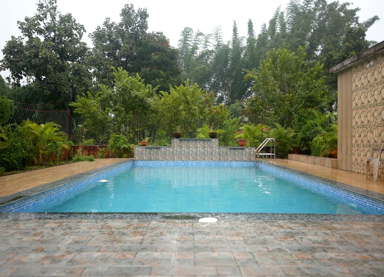 Indulge in relaxation beside our expansive, impeccably maintained swimming pool—a signature oasis that beckons guests to unwind and rejuvenate in serenity. The lush, verdant surroundings complement this tranquil haven perfectly, offering an enchanting backdrop to your leisure moments.